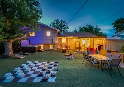 ☑️ Backyard oasis with hot tub, grand chess set, BBQ patio with string lights.